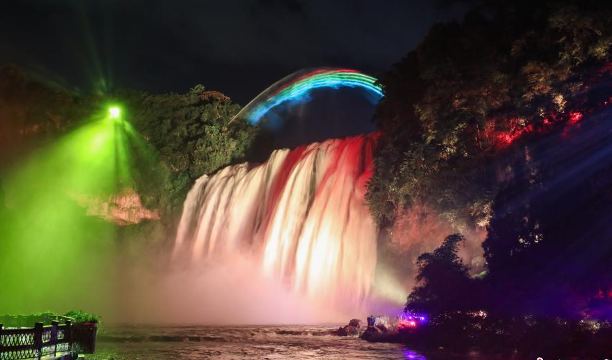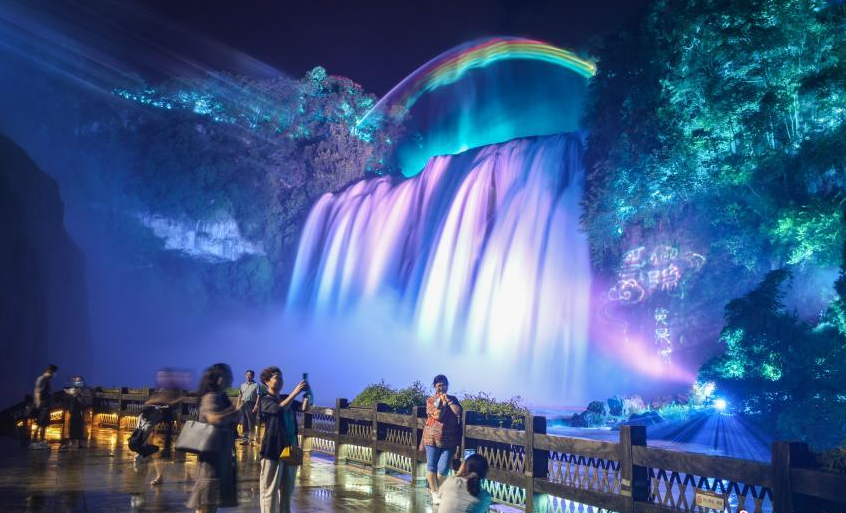 走進夜幕下(xià)的貴州黃果樹瀑布,領略黃果樹瀑布與日間壯美不同的驚豔夜色。一(yī)場“3D夢幻”光(guāng)影秀每天都會(huì)在這裡(lǐ)上(shàng)演,燈光(guāng)和3D投影在黃果樹瀑布上(shàng)變換著(zhe)各種視覺特效,瀑布在光(guāng)影秀中如夢如幻,虹光(guāng)漫天,橫亘天幕,山水(shuǐ)光(guāng)影聯動,帶給遊客有别于日間體驗的沉浸式“光(guāng)影盛宴”,流光(guāng)溢彩又(yòu)美又(yòu)仙。