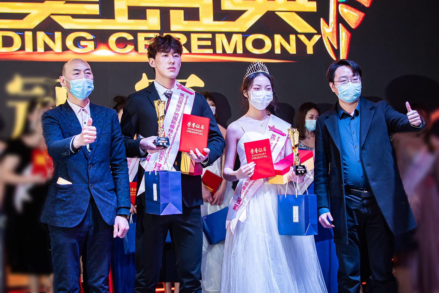 禹州市(shì)盧鈞窯藝術(shù)品有限公司總經理盧騰飛(fēi)先生(shēng)和維羅納國(guó)際模特大賽秘書長(cháng)徐偉先生(shēng)共同為(wèi)冠軍頒獎合影