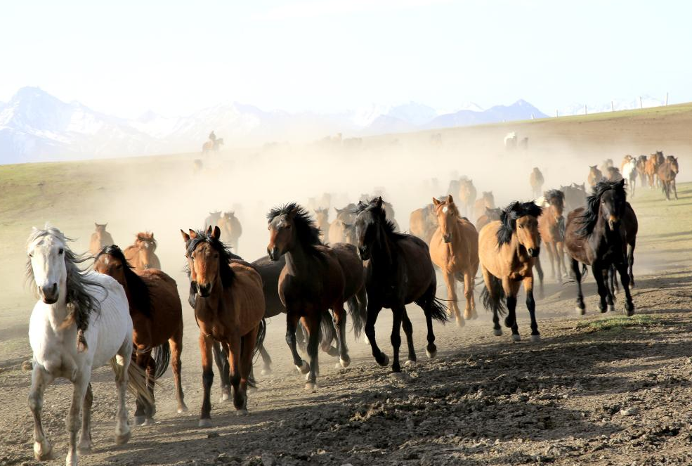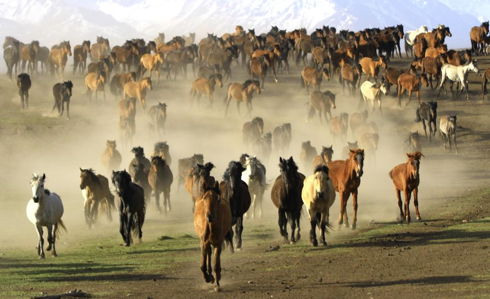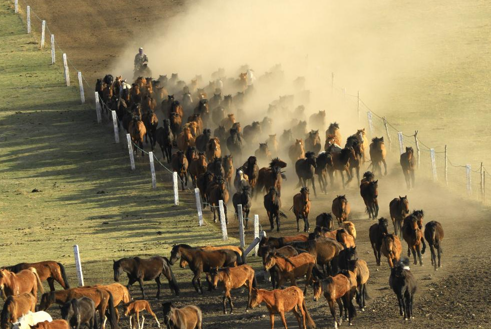 5月(yuè)19日,甘肅張掖,數百匹駿馬奔馳在山丹馬場的草(cǎo)原上(shàng),牧人揚鞭,群馬奮蹄,場面壯觀。