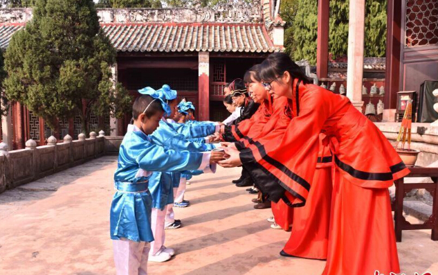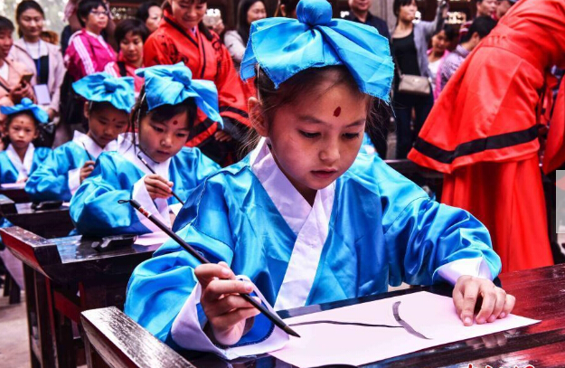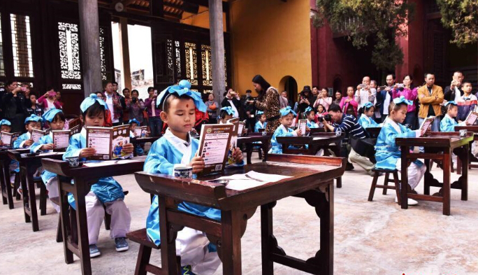 11月(yuè)5日,廣西(xī)桂林市(shì)恭城(chéng)瑤族自(zì)治縣在文廟舉行秋季開(kāi)筆典禮,數十名小(xiǎo)學新生(shēng)身著(zhe)漢服,先後進行祭孔、行禮、朱砂開(kāi)智、擊鼓明智、啓蒙描紅(hóng)等儀式,并集體朗誦《弟(dì)子規》。