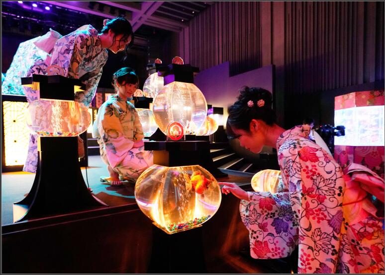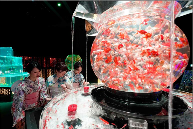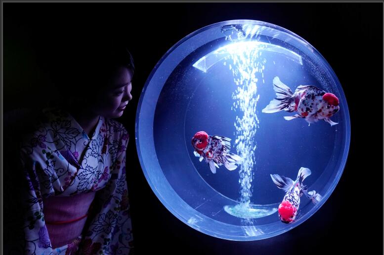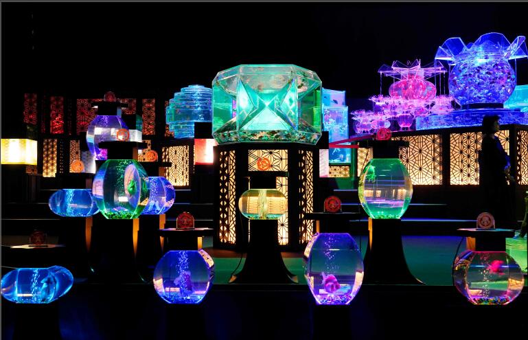 2019年(nián)7月(yuè)4日,日本東京,Art Aquarium 2019 金魚藝術(shù)展舉行,身穿夏季和服的女孩們在缤紛的光(guāng)影中觀賞一(yī)萬多(duō)條五彩的金魚。