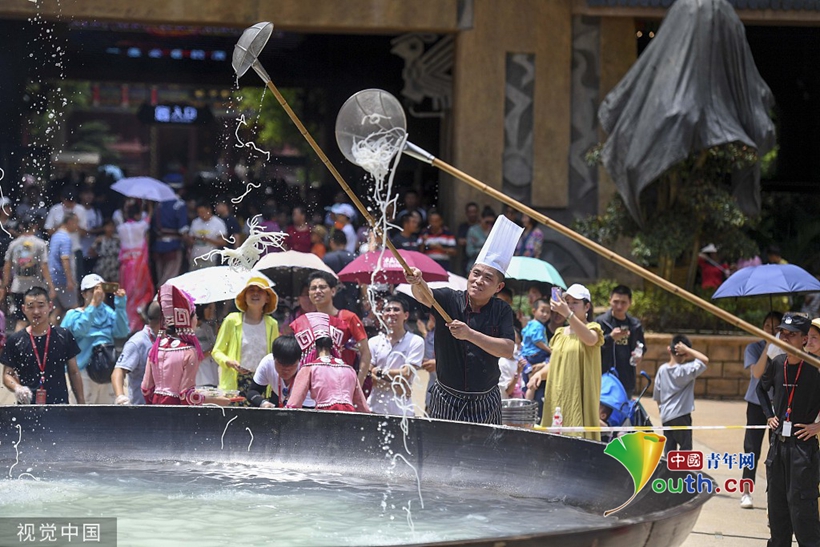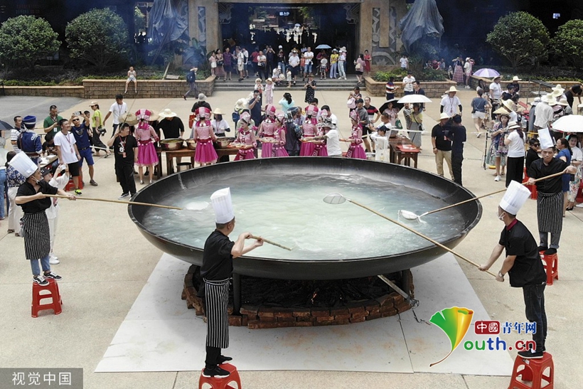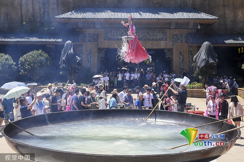 2019年(nián)7月(yuè)24日,桂林一(yī)景區支起了一(yī)口面積達50平方米的巨型鐵鍋,女演員(yuán)在10米高(gāo)空向鍋中下(xià)米粉,邀請遊人免費(fèi)品嘗。