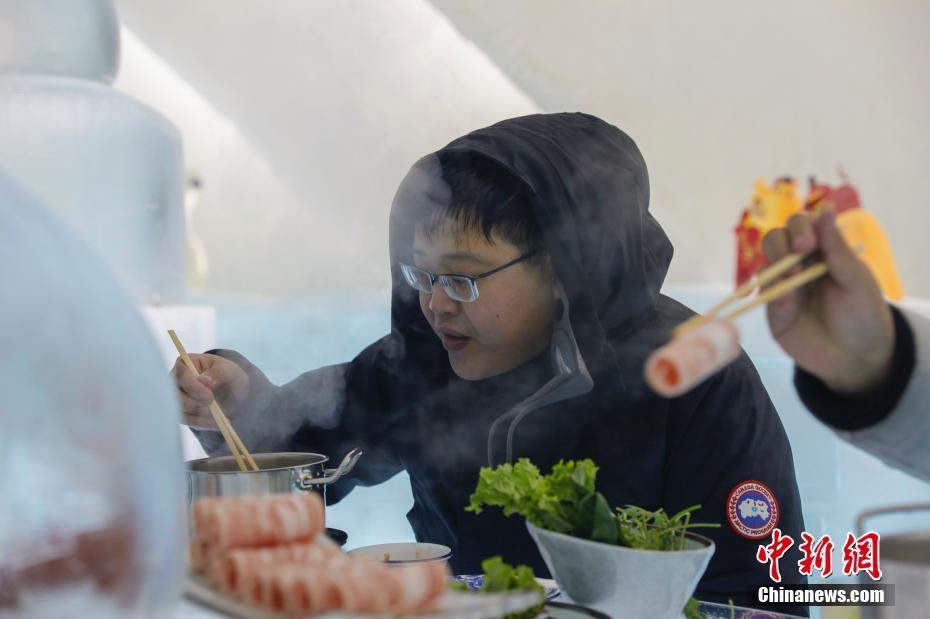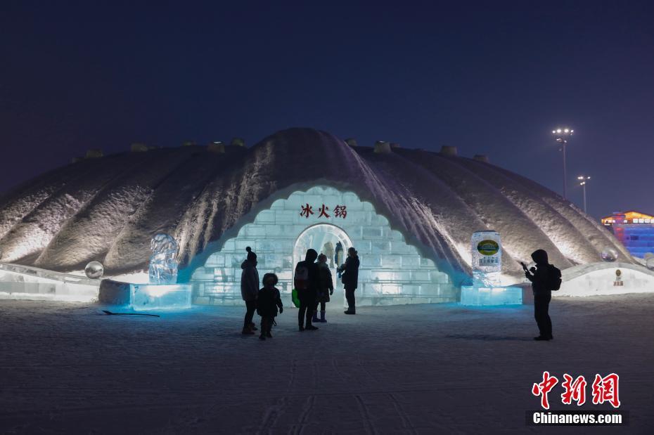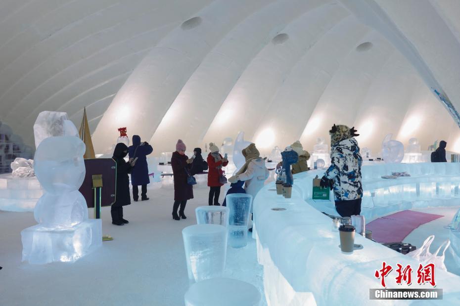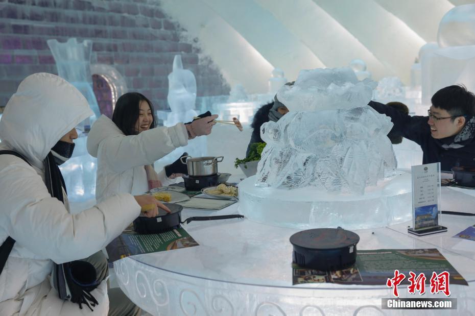 1月(yuè)11日,遊客在哈爾濱冰雪大世界室園區内的冰屋涮火鍋、喝啤酒,用冰塑造的房屋、桌椅、吧(ba)台、酒杯等物(wù)品顯得晶瑩别緻。圖為(wèi)遊客參觀冰屋火鍋。