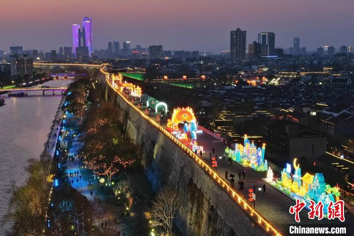 3月(yuè)14日,航拍南(nán)京明城(chéng)牆中華門(mén)甕城(chéng)至赤石矶段,大型燈組在夜色中“綻放(fàng)”。從(cóng)3月(yuè)13日起,受新冠肺炎疫情影響而關閉的南(nán)京城(chéng)牆燈會(huì)華麗“重啓”,再現流光(guāng)溢彩的景緻。