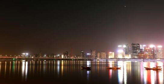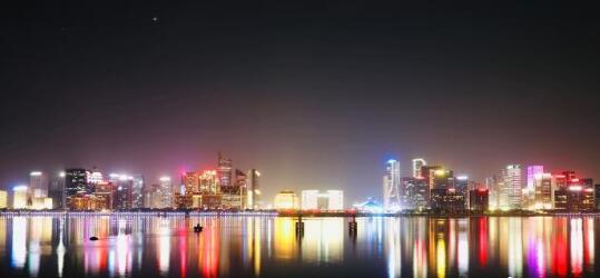 杭州錢(qián)江新城(chéng)夜景在錢(qián)塘江面形成絢麗倒影。