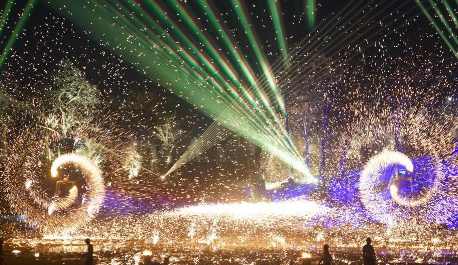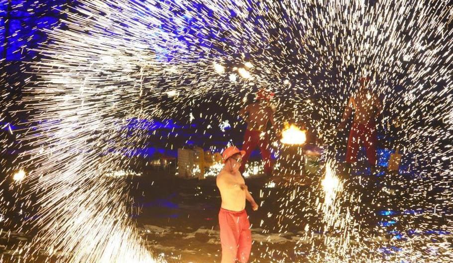 2月(yuè)25日,農曆正月(yuè)十四晚,河南(nán)開(kāi)封萬歲山景區上(shàng)演傳統民(mín)俗“打鐵花”,慶祝元宵佳節。圖為(wèi)震撼的鐵花秀。