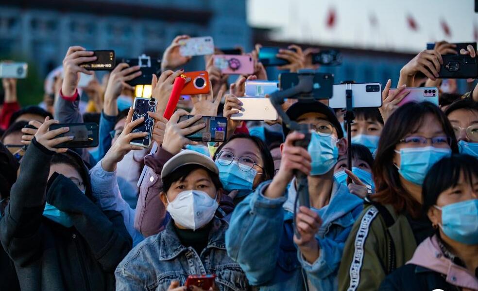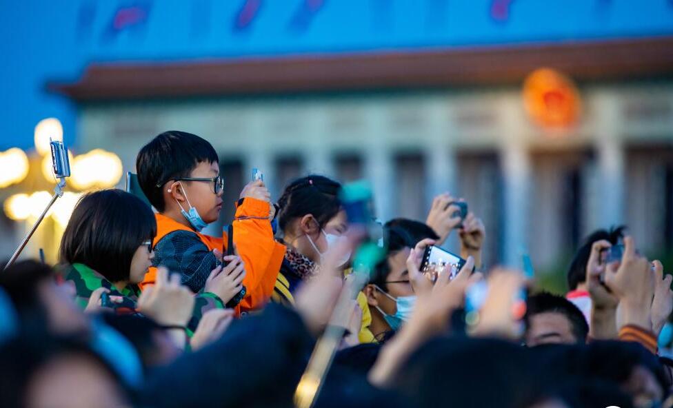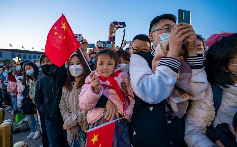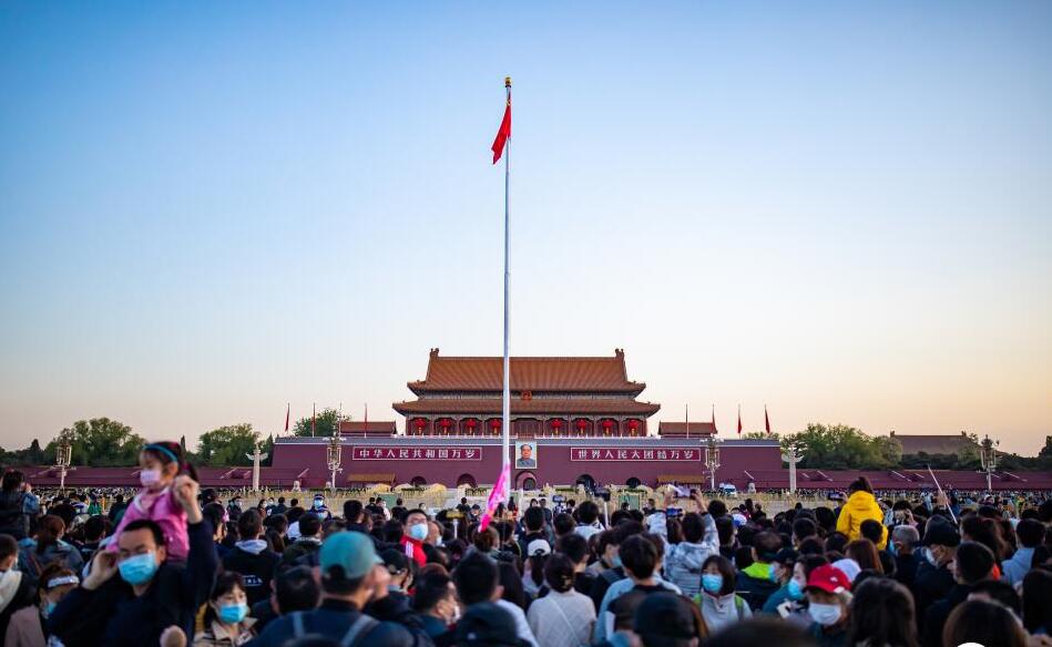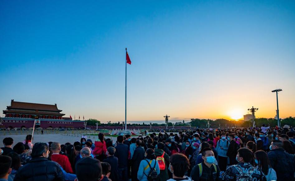5月(yuè)1日,來自(zì)全國(guó)各地的遊客在北(běi)京天安門(mén)廣場觀看(kàn)升旗儀式。聽雄壯國(guó)歌(gē),看(kàn)五星紅(hóng)旗與清晨的太陽一(yī)起升起。