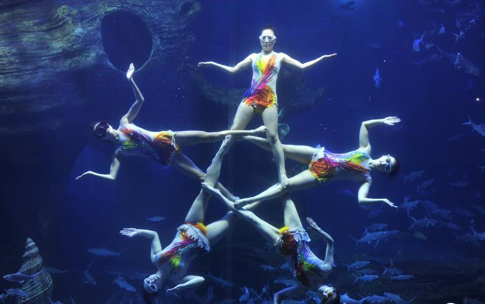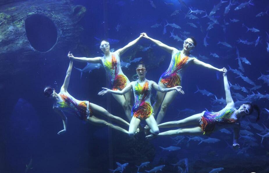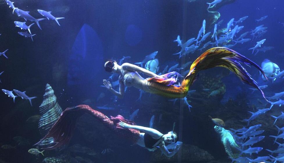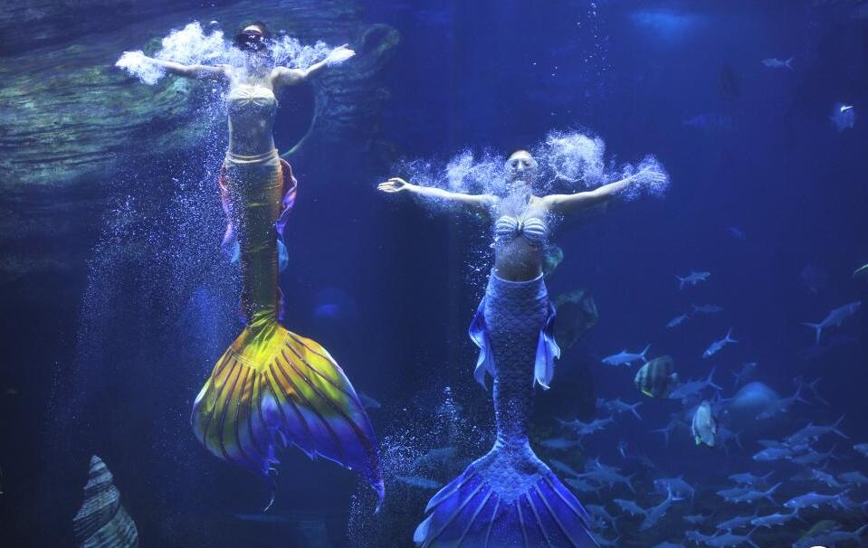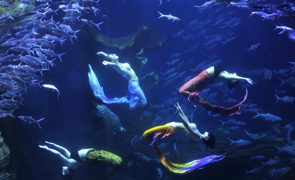 2021年(nián)5月(yuè)4日,“美人魚”在貴州省貴陽市(shì)海洋世界表演。五一(yī)假期,在多(duō)彩貴州城(chéng)極地海洋世界,五名來自(zì)貴州的女演員(yuán)為(wèi)遊客進行水(shuǐ)下(xià)芭蕾和美人魚等節目表演,優雅的水(shuǐ)下(xià)身姿吸引了衆多(duō)遊客。